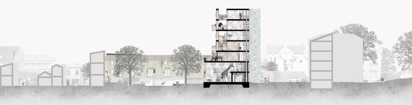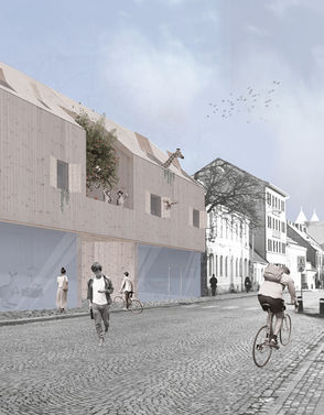 The wall that worked as a barrier towards the street before got replaced by a new mix-use building with the gate dividing the first floor into two separate spaces; one commercial and one for study. The second and third floor is all devoted to housing and the whole building, "the street house" is a modern interpretation of the traditional street house in Lund, where it’s now been lifted up and resting on a glassed ground floor. The whole first floor consists of mainly glass that eases to gaze thru and see what is on the other side, also the tunnel creates a peephole into ”the Paradise” that will catch peoples interest to walk in.